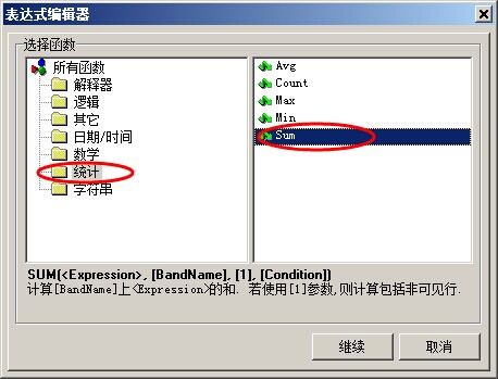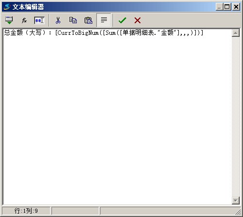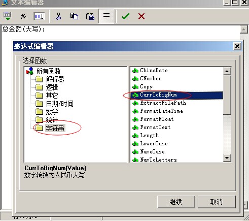 再來(lái)插入一個(gè)大寫(xiě),累計(jì)金額。同樣是選擇插入函數(shù),選擇字符串中的,CurrtoBigNum, 點(diǎn)繼續(xù)按鈕,然后把之前得出的結(jié)果[Sum([單據(jù)明細(xì)表."金額"],,,)]復(fù)制到里面。