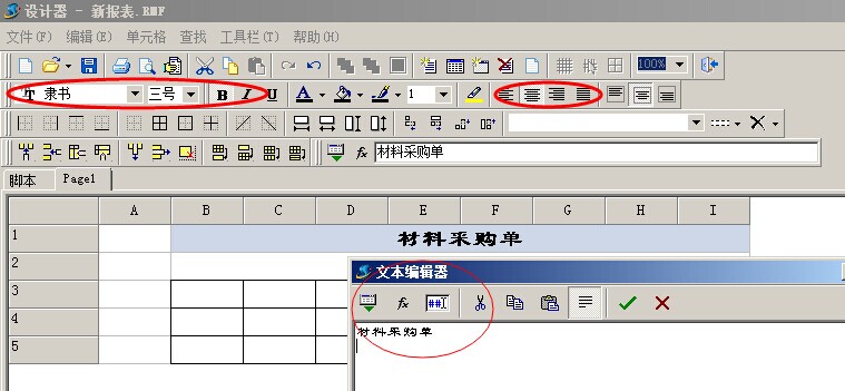 5. 雙擊第一行輸入,在彈出的文本框中,輸入打印標(biāo)題的名稱例如材料采購(gòu)單。然后選擇字體及大小。