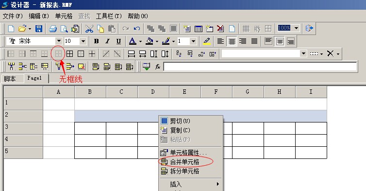 4. 首先我們選中A 列或第一行、第二行后,點(diǎn)擊工具欄的無(wú)框線按鈕,把第一行和A列的邊框隱藏掉。然后我們點(diǎn)擊鼠標(biāo)右鍵,使用【合并單元格】合并第一行、第二行的單元格。