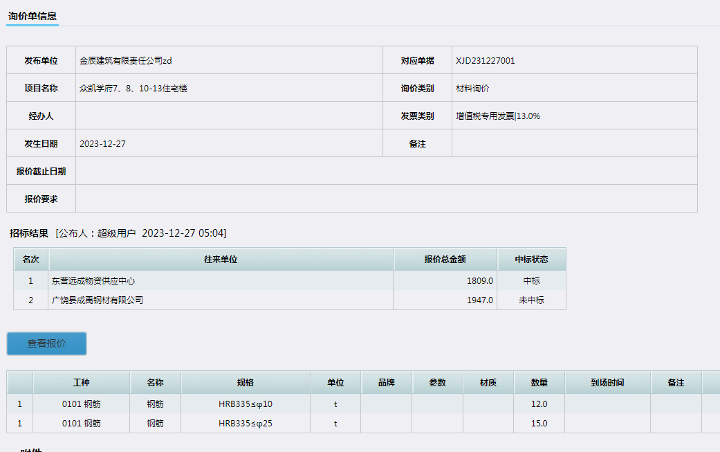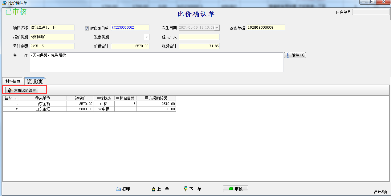 在比價(jià)確認(rèn)單確定好供應(yīng)商后可以直接發(fā)布比價(jià)結(jié)果