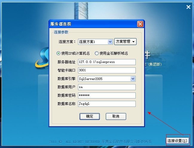 在彈出的窗口中填寫好:服務(wù)器ip地址、智能卡端口、數(shù)據(jù)引擎、數(shù)據(jù)庫用戶、數(shù)據(jù)庫密碼、數(shù)據(jù)庫名稱。