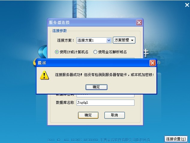 試用版或加密鎖沒插好,則會(huì)提示連接服務(wù)器成功!但沒有檢測(cè)到服務(wù)器智能卡,或本機(jī)機(jī)密鎖