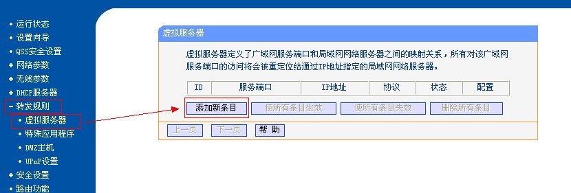 點(diǎn)左側(cè)菜單中轉(zhuǎn)發(fā)規(guī)則,在打開的菜單中點(diǎn)虛擬服務(wù)器,然后在右側(cè)虛擬服務(wù)器框中點(diǎn)添加條目,