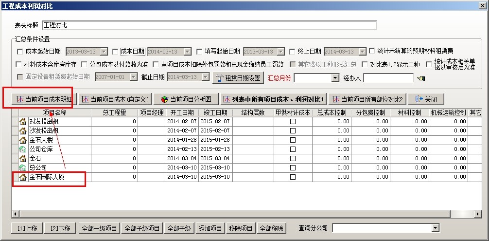 打開(kāi)項(xiàng)目成本利潤(rùn),選擇要查詢的項(xiàng)目,點(diǎn)擊當(dāng)前項(xiàng)目成本明細(xì)(也可以在系統(tǒng)全局設(shè)置中自定義項(xiàng)目成本利潤(rùn)表,在查看成本利潤(rùn)的時(shí)候,選擇第二項(xiàng),當(dāng)前項(xiàng)目成本(自定義))