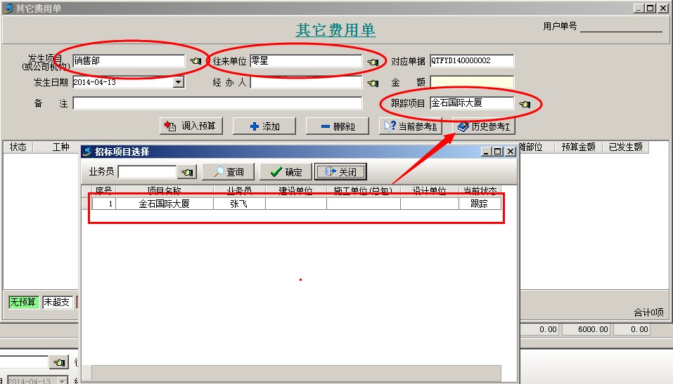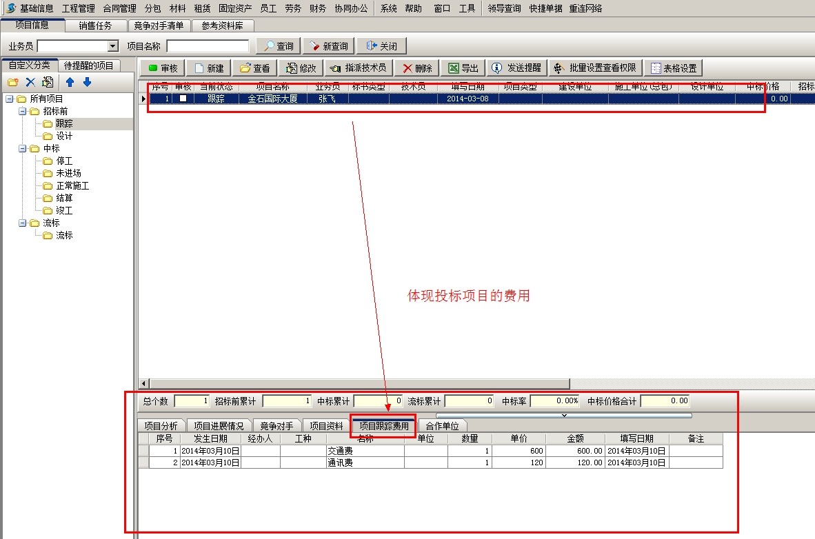 以公司的“市場(chǎng)部”或“銷售部”來(lái)進(jìn)行前期費(fèi)用的承擔(dān)。如果項(xiàng)目沒(méi)有中標(biāo),則前期跟蹤費(fèi)用自然歸屬到該部門(mén)下,如果中標(biāo)通過(guò)在【項(xiàng)目維護(hù)】中新建項(xiàng)目,從項(xiàng)目開(kāi)拓中引入,并確認(rèn)結(jié)轉(zhuǎn)費(fèi)用即可。