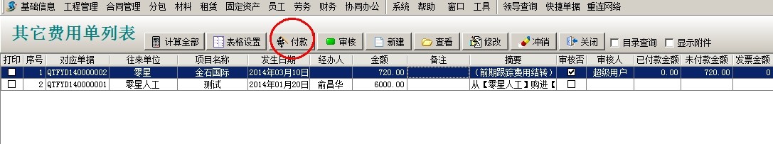 選中單據(jù)點(diǎn)擊付款,選擇支付方式,點(diǎn)保存。項(xiàng)目開(kāi)拓中可以查看到該投標(biāo)項(xiàng)目發(fā)生的費(fèi)用